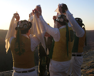 This Sunday, the first day of spring, we climbed up Lantern Hill. By the light of the super moon we climbed along one side to the top and by the light of the first sunrise of spring we walked down the other. At the top the Westerly Morris Men danced for the 25th year. We met with friends, watched the men dance on the edge of a cliff and remembered: George Utter, a long time member of the team, recently passed away and though the last few years he could not make the climb he would wear the hobby horse and greet hikers at the base of the trail. A family was instructed to bring their mother, grandmother, great grandmother and great great grandmother's ashes to the annual event. They had never come before and were startled by how many people where there, but with everyone's support spoke a few words about her and scattered her ashes. We drank a toast in George's memory and went to breakfast, in that order. Pictures from the morning here.