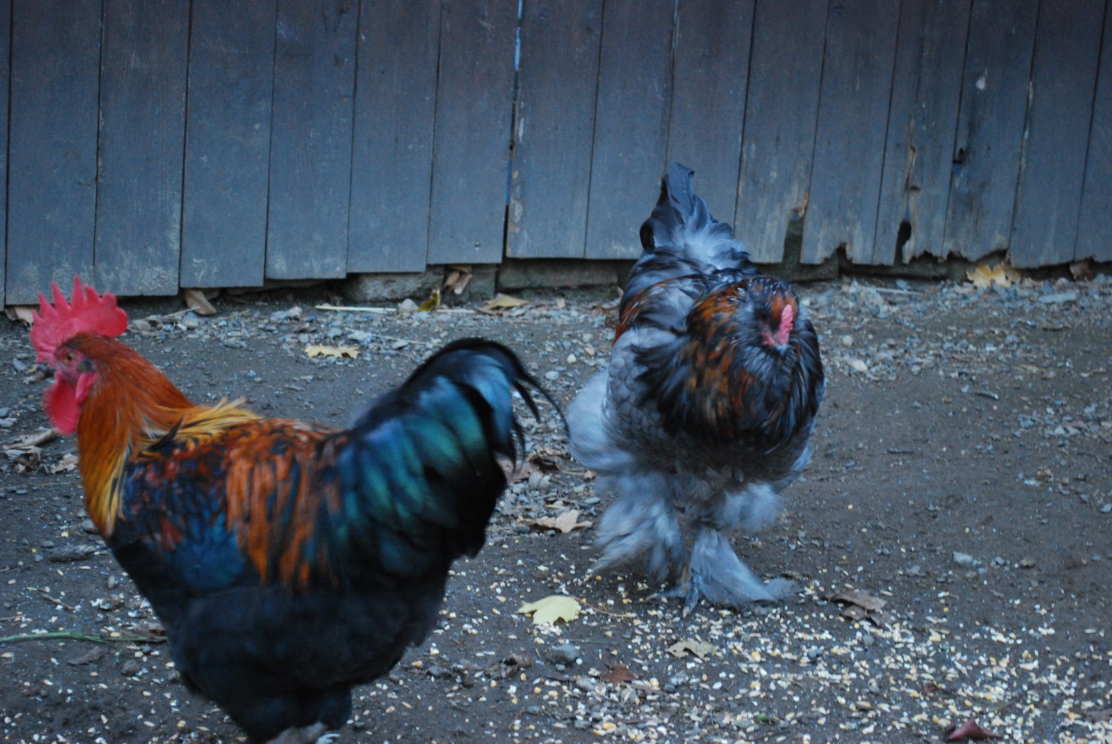 So that leaves me with 4 young girl-chickens or pullets - since they are not laying yet - The small grey hen is "Mouse", the two huge grey fluffy hens with the copper feathers around their necks are "The Pennys" then the big fluffy black hen with the copper feathers who would have been Miele is probably going to end up Elvira (Mistress of the Dark) since she tends to exit the coop at night when I go hunt for eggs, and poke around the food!