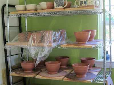 I am working on getting a kiln load dry and ready to bisque in the next 2 weeks. All those little bowls on the top two shelves of the drying rack have to be in Vermont before the end of the month!