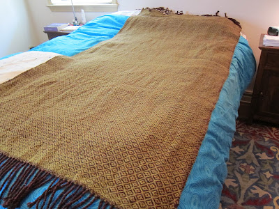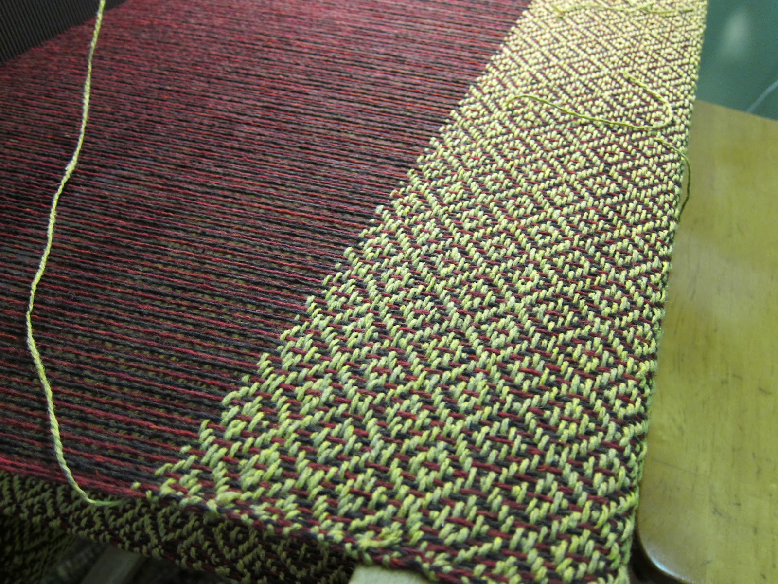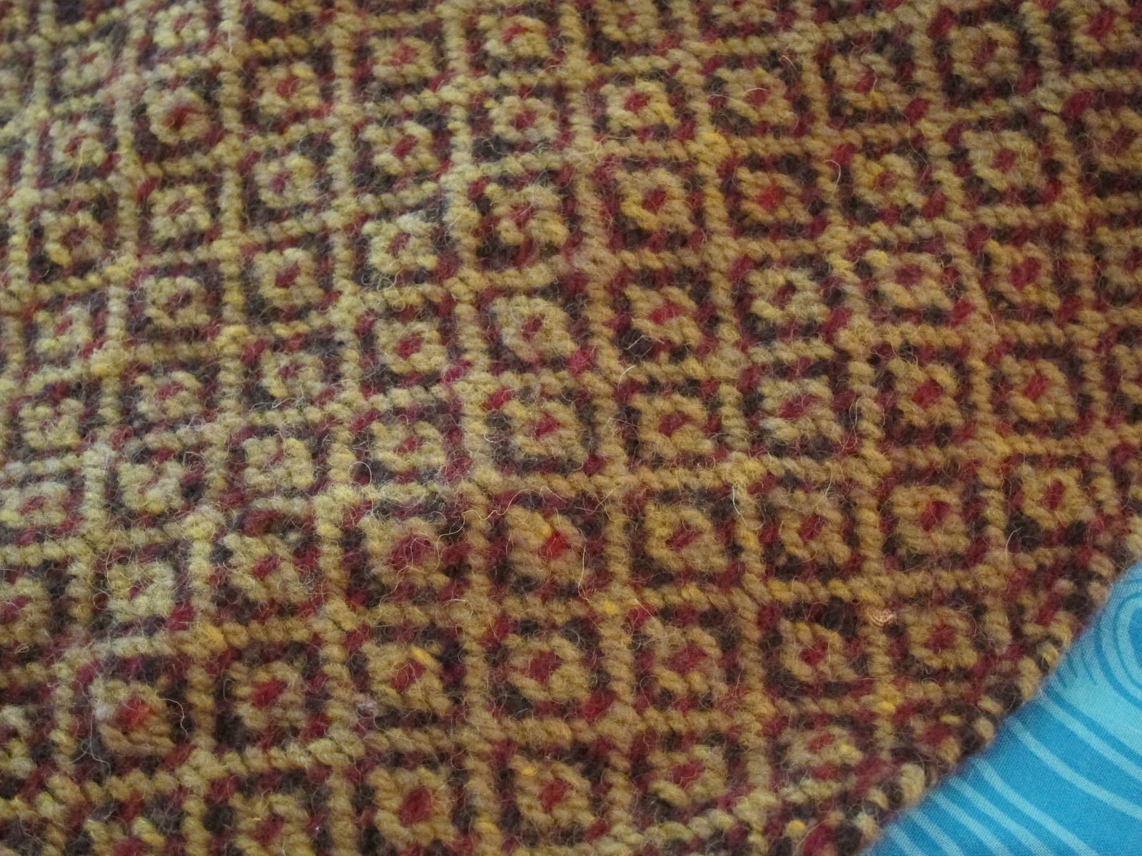 I’m thrilled with how drapey the table runner is. My only problem is that I have no idea what to do with it – it’s 33 inches by 22 inches. It’s too short for a scarf, but I don’t have an appropriate table to use it on. It’s a superwash merino/bamboo/viscose blend. Folded over a towel bar it’d make a very long kitchen or guest towel, I guess?