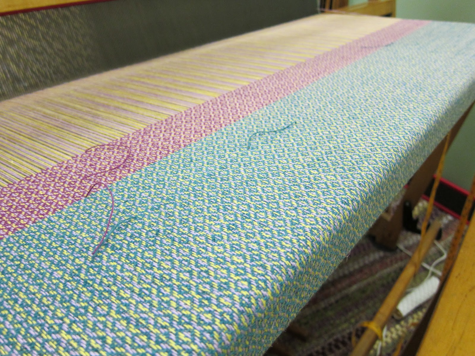 So, online I mentioned in the last post that I had finished 2 objects – side effects and the June Spunky Eclectic Weaving Club, which I opted to do a table runner. It was my first experience with using a pick-up stick. I’m happy with how both came out (especially after ironing the scarf…I don’t even iron clothes!).