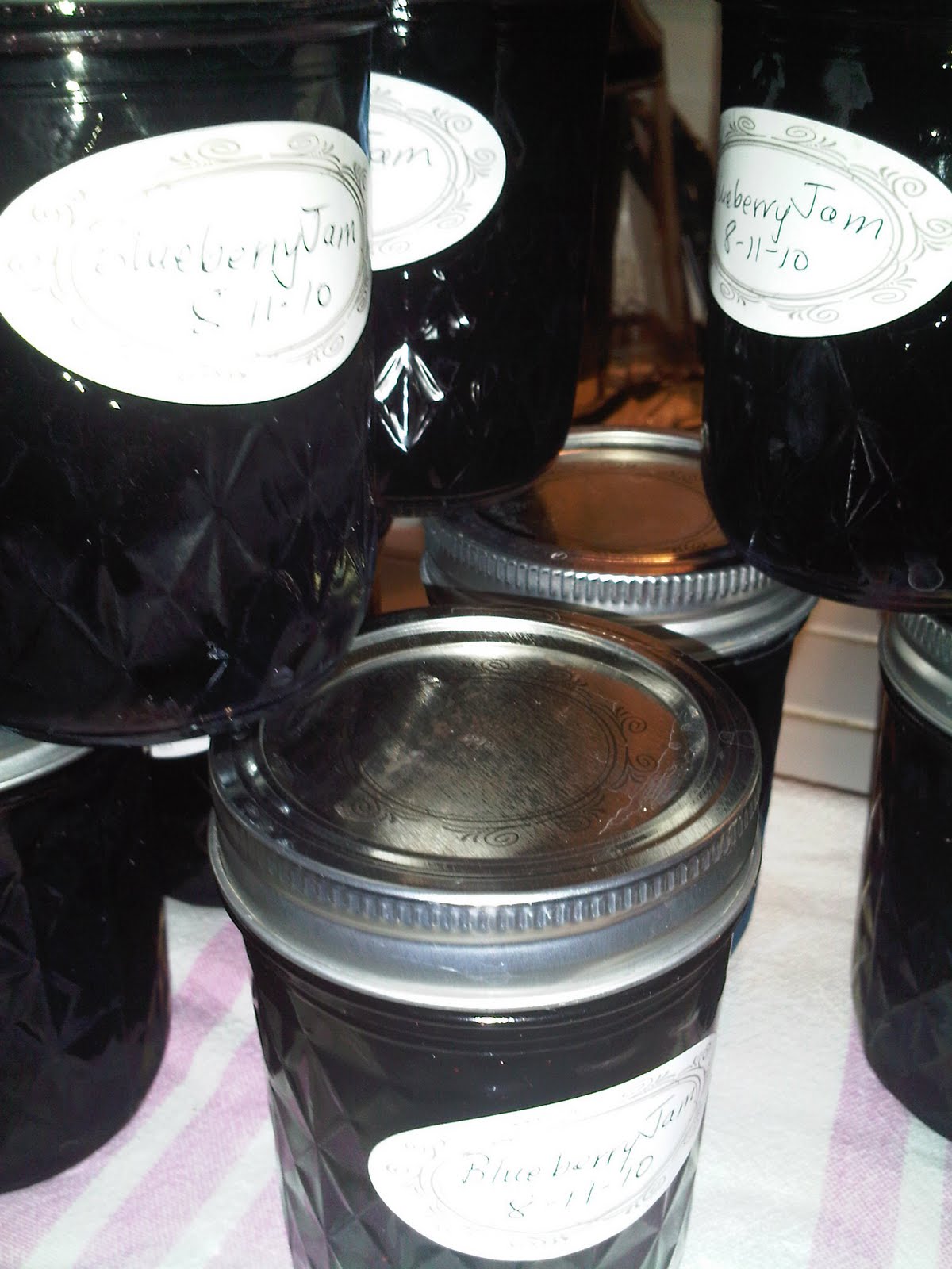 After eating blueberry pancakes for nearly a week, munching on handfuls of them for snacks, and offering them up to visitors every chance I got, yesterday was the day that the abundance had to be made up into blueberry jam.  Rowan was here to help--she did a good job of mooshing up the berries with the potato masher and put the labels on beautifully!  What a great helper she is!!