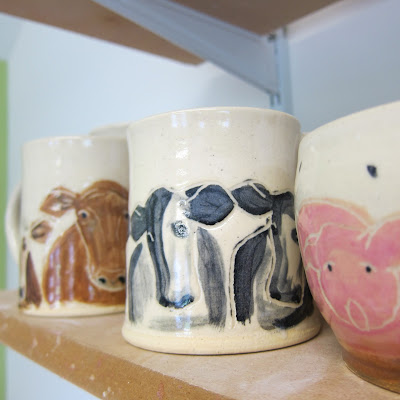 AND I finally fired the glaze kiln full of all those piggies and cows I posted about earlier. Sometimes it just seems to take awhile to gather a full kiln load. (Mine is 7 cubic feet if you were curious. Not too big, and not too small....) I am happy with all the results.