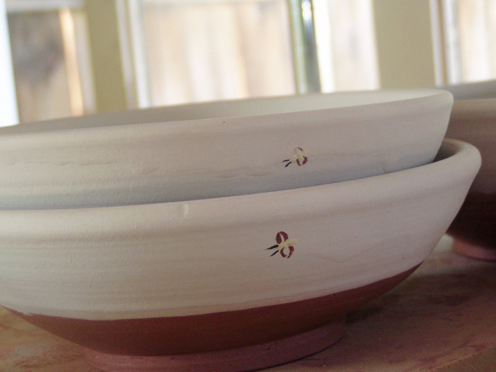 Below are some assorted farm style cereal bowls, slipped and painted and ready to go.