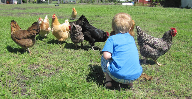Asher was fascinated by the chickens, who are just tame enough to hang around close, and keep him engaged.