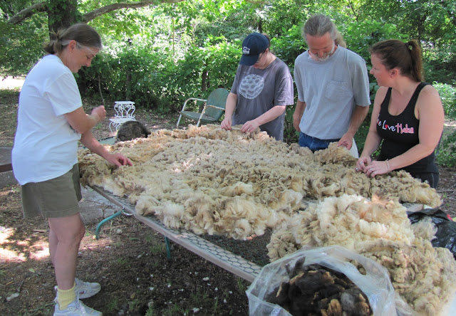 But the job’s not over once the sheep’s shorn! In their varying levels of wholeness– ranging from the gorgeous waterfalls of wool produced by some of the experienced shearers to the utterly destroyed scraggles produced by all of us beginners– the fleeces were taken to the skirting table and sorted. As someone who erred on the side of second cuts, I felt a little guilty!