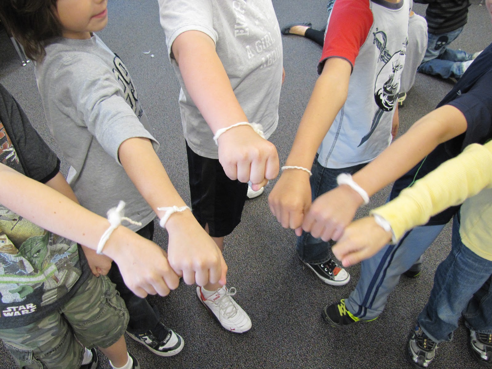 First, everyone gets a partner.  Then, a small handful of wool and an unbent paperclip is all it takes.  Hook the paperclip into the puff of wool and start twisting.  The pair has to work together, one twisting and one drafting, to make this work.