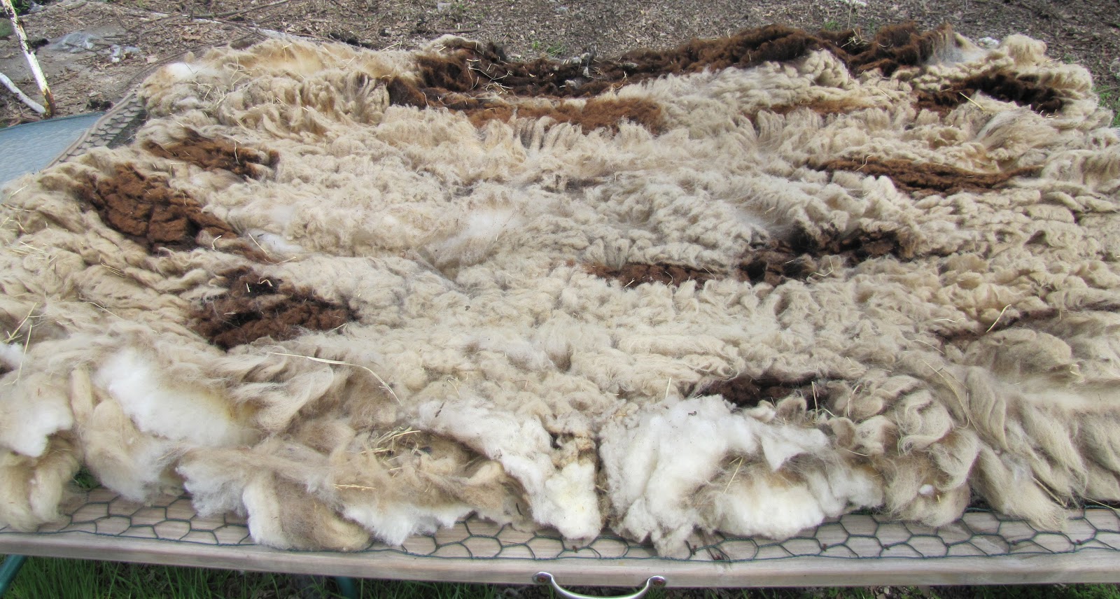 First, we lay the fleece out on the screen skirting table, cut ends down. We see what we saw on the sheep before shearing - the outside of the fleece. We can see all the grassy areas, and the coarse, icky areas.