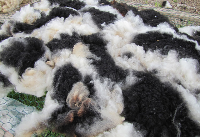 The second cuts, or the tiny bits of wool that are caused by the shearer going twice over the same spot, are easy to see when they stick to the opposite colored wool. We pick those off and toss them to the birds, for nesting material.