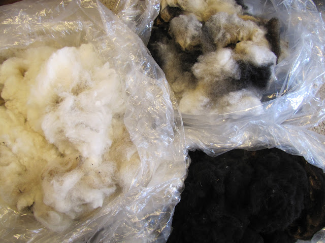 Here are my three bags full - black, white, and mixed. These batches are ready to be washed. When they're clean, we can continue to remove any grass or short bits that have not been separated out yet. The mixed wool, when carded, will become a gorgeous heathered gray. With three different colors of wool from one sheep, you can see that the possibility for natural colorwork is vast - fair isle patterns, stripes, mosaic knitting -- you name it.