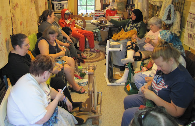 Meanwhile, at the other end of the property, the Little Red Barn was filling up with a near-record-breaking turnout of knitters and spinners. We've observed a law of nature that when someone has to leave early from the LRB, more people come to take their place, and we always seem to have enough chairs. It's a mystery beyond science how this happens every time...