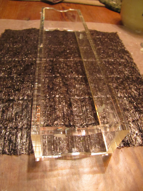 Lay out a sheet of nori on a cutting board.  Center your handy-dandy sushi press in the center.  I got my press in Hawaii, but I bet the Asian stores here have them, too.
