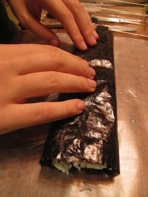 Carefully remove the form and roll up one edge of the nori.  Wet the other edge of the nori, which makes it sort of self-adhesive.  Kind of like wetting the flap on an old-fashioned envelope.  I use my finger dipped into a cup of water.