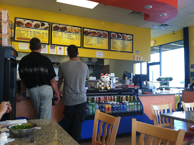 Sure enough, it looks and feels for all the world like a fast food lunch counter in any little town you might visit in Hawaii.  There's no such thing as haute cuisine in Hawaii - it's all a hodgepodge of lots of ethic foods served up on a styrofoam plate - Hawaiian, Portuguese, Chinese, Japanese, American, Korean, and more.  And I love it.  Some of my favorites are featured at L & L: saimin (like ramen, only a million times better), teriyaki everything, barbeque everything, seafood, and the best snack food ever - musubi.  And not only do they have musubi, but several different kinds: Spam, chicken katsu, and bbq chicken!  Now we're talking.  The food is a touch pricey, but cheaper than a plane ticket.