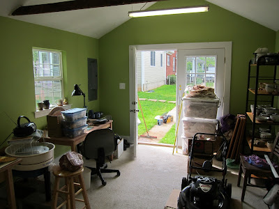 My next steps are to put up open shelving over the canvas covered counter in the back for chemicals.   Put together another metal shelf for next to the kiln door (unless I find a cheap cabinet with a countertop easy to clean after mixing glaze chemicals....)  And to install more of those metal strips for green ware shelves.  Neither of these pictures show it but I do have one of those massive rolling shelves from Costco.  It works great for green and bisque ware.