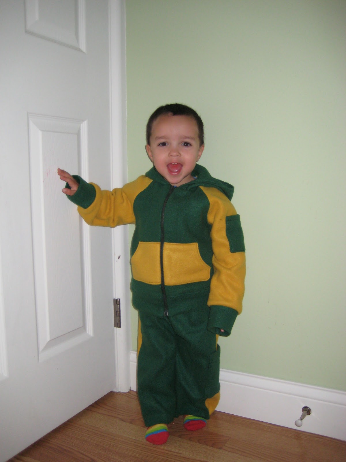 Current ProjectsToday I finished Peanut's Fleece Packer outfit. Why make it? My child has a head the size of an adult (20" around) and we have to always buy his shirts a size or two bigger so as to not shove his eyeballs into his head putting on a shirt. Not to mention his torso is a little bit long for his age too. Well, unfortunately, it's not cost effective to buy two track suits, one that fits the bottom and one that fits the top, so I picked out a McCall's pattern where I could make the jacket bigger and the pants smaller.