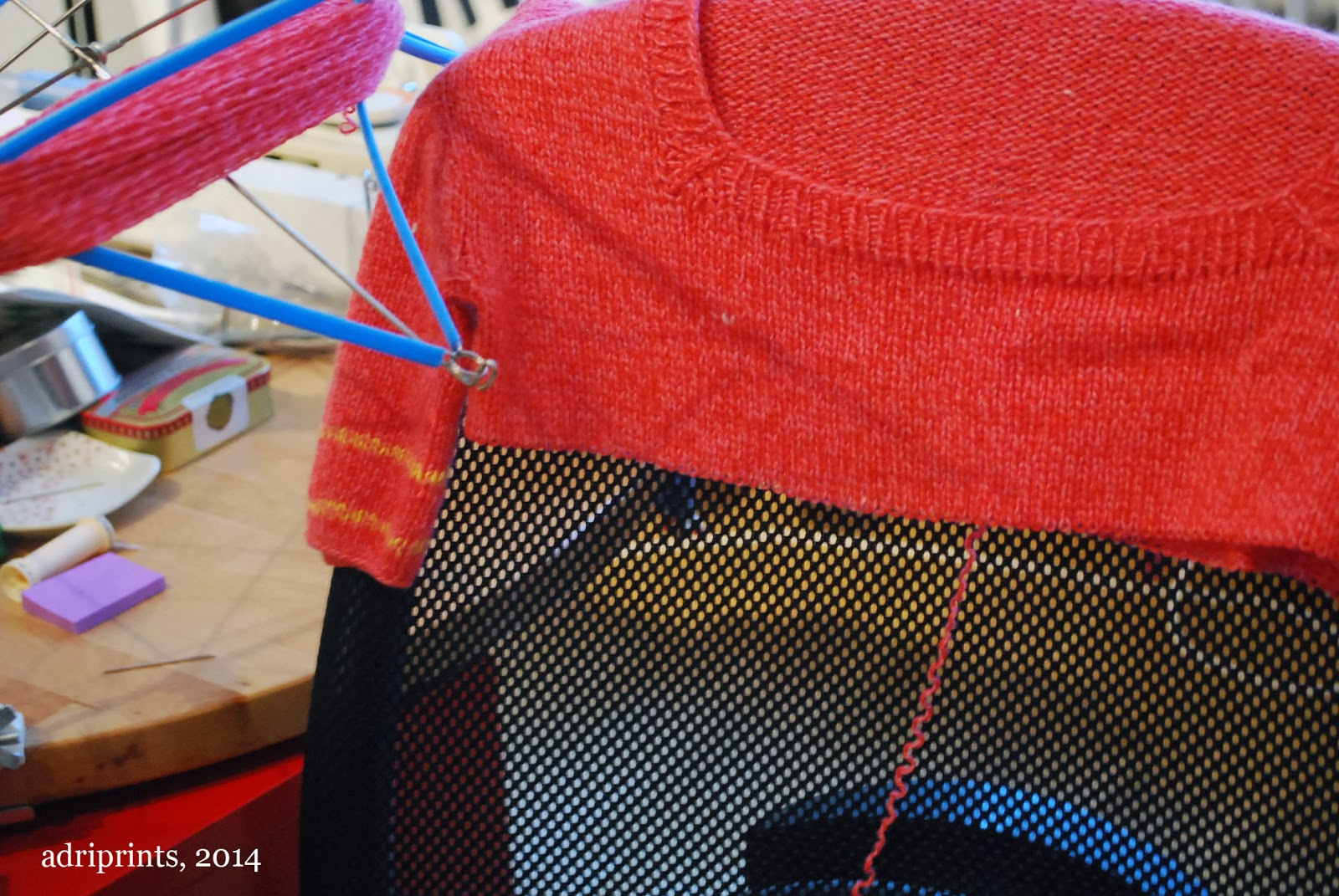 Using a vague version of her technique, I used the knitting machine to knit up one skein of yarn into a kind of blanket or wide scarf.